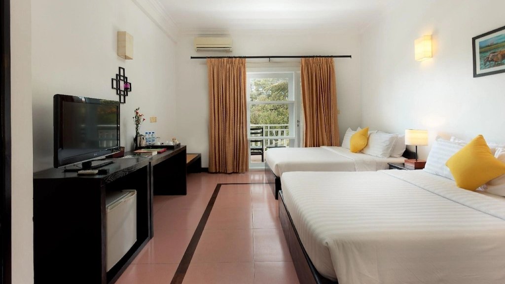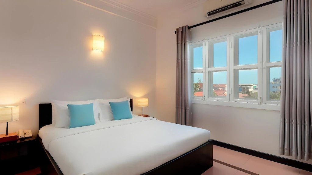 Chambres et suites au design khmer contemporain, mêlant confort moderne et touches artisanales. Certaines offrent balcon ou baignoire avec vue sur le jardin ou la piscine.
