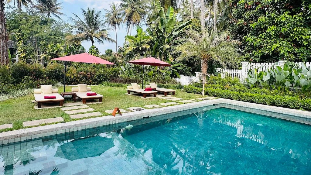 Un domaine verdoyant avec un étang de lotus offrant calme et sérénité au cœur de Luang Prabang.