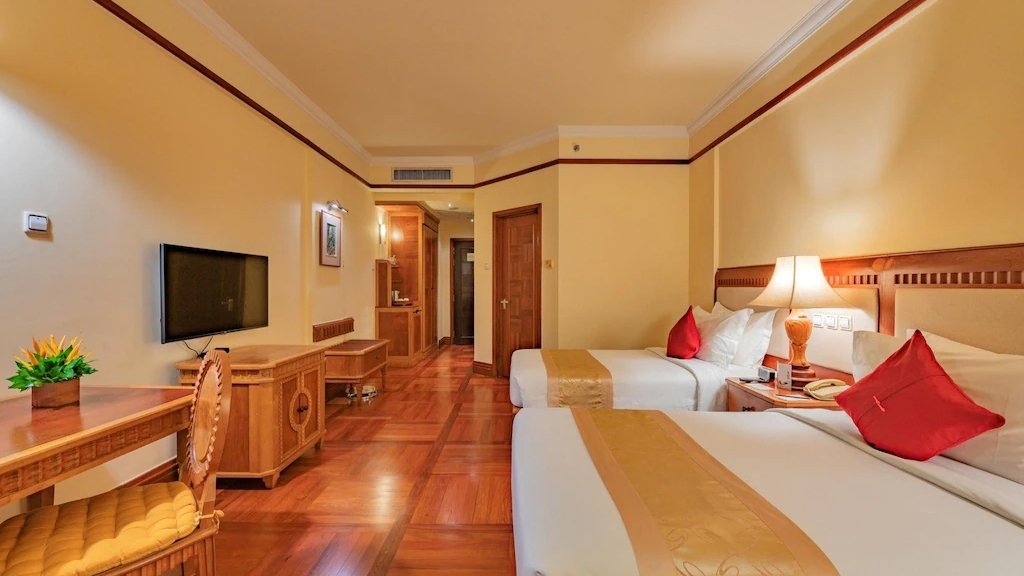 Sokha Angkor Resort vous accueille dans un cadre d’inspiration khmère, où chambres et suites mêlent élégance traditionnelle et confort moderne. Chaque espace est pensé pour offrir une atmosphère paisible, sublimée par des matériaux chaleureux et des touches artisanales locales. Certaines chambres s’ouvrent sur la piscine ou les jardins tropicaux, invitant à savourer pleinement la quiétude de Siem Reap.