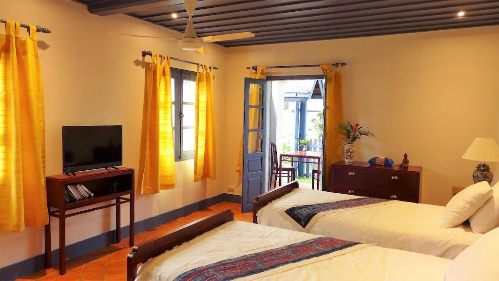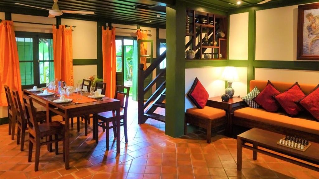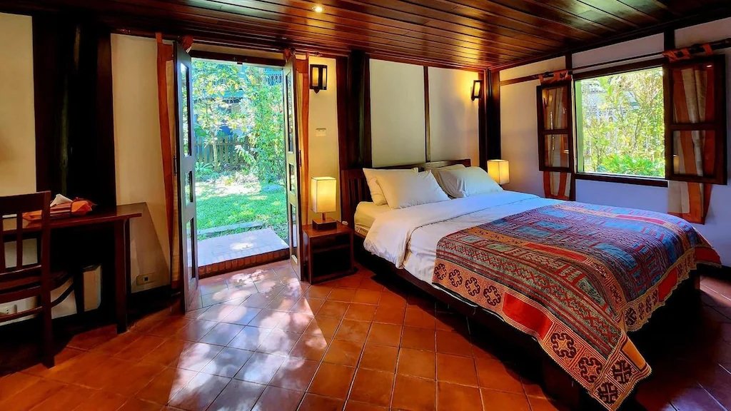 Les bâtiments sont d’anciennes maisons en bois restaurées selon les techniques locales, offrant une immersion unique dans le patrimoine de Luang Prabang.